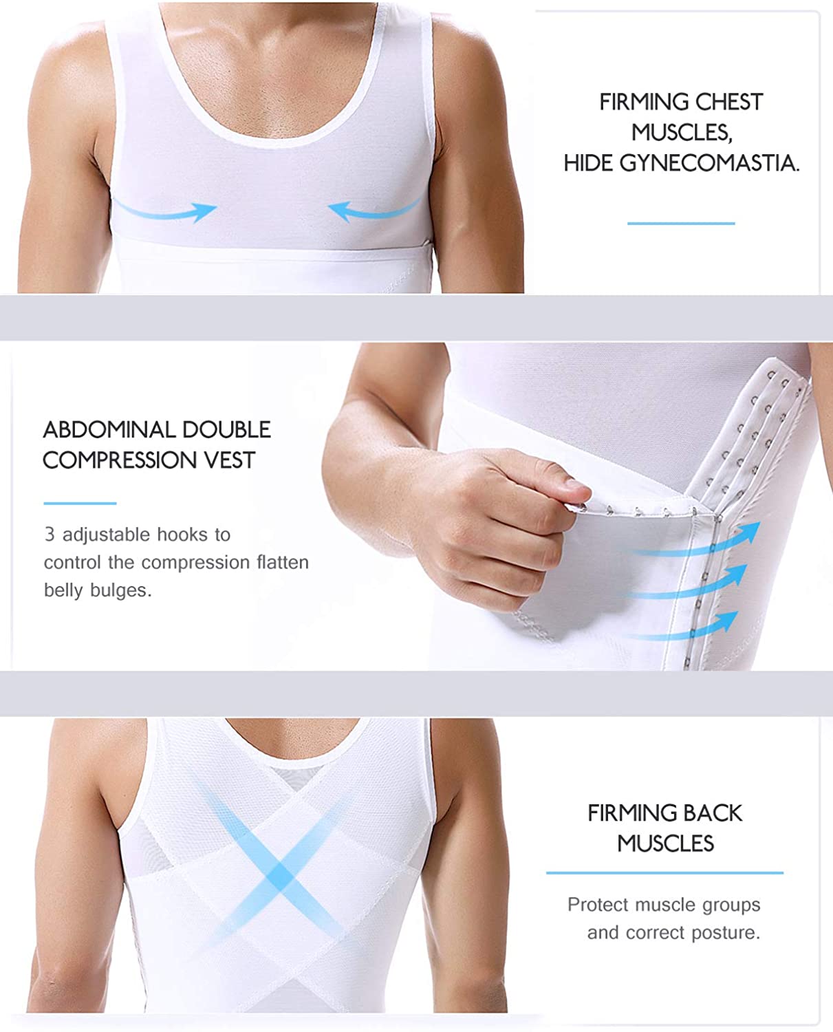 The mens body shapers which were designed with stretchy mesh fabric on upper chest, strengthens the compression in the chest, remove gynecomastia, reshape natural high chest muscle curves as well as wick moisture away to keep you staying cool. Criss-cross support bands on back for posture correction.