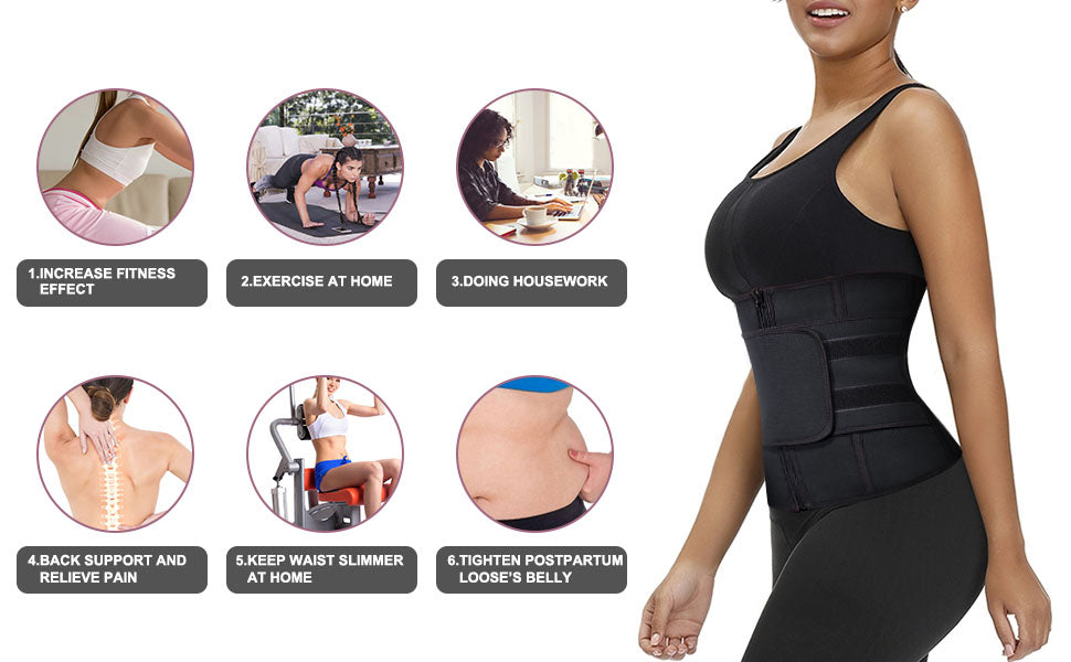 ※ 3-row hook /Zip front closure+ adjustable waistband with velcro closure, the strong velcro provide full compression and control which flattens the stomach.It will help you increase your core temperature during exercise and burns more fat in your abdomen.